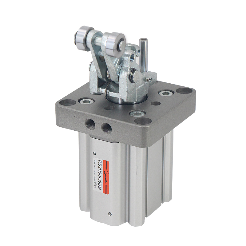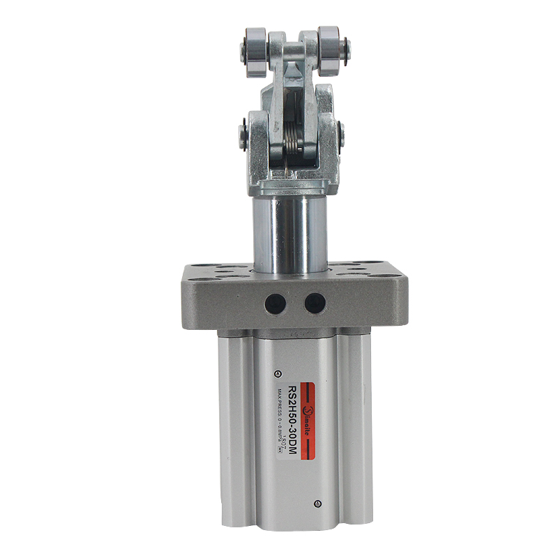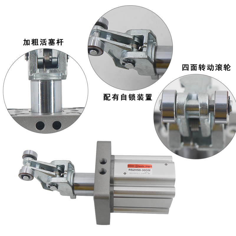 斯麥特生產(chǎn)的RSH系列阻擋氣缸加粗活塞桿,能有效提高氣缸抵抗沖擊的能力;杠桿式滾輪結(jié)構(gòu)阻擋氣缸配有自鎖裝置,可防止搖臂回彈對(duì)被阻擋物體的回推。