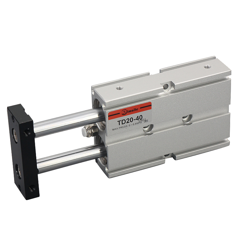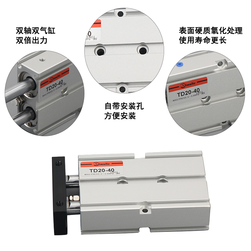 1、TD系列雙軸氣缸是雙軸雙氣缸,實現(xiàn)雙倍出力